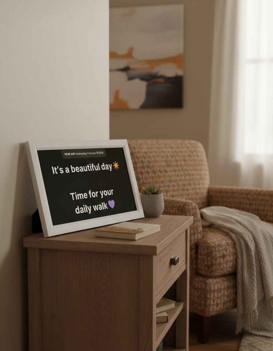 It helps caregivers provide gentle reminders, daily structure, and reassuring messages throughout the day.
